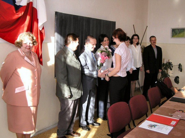 Na první momentce (ze zahájení maturit) student IV.S Bohumil Klof při předávání květin maturitní komisi. Na druhém snímku (v čele stolu) předsedkyně maturitní komise Mgr. Hana Lisá, místopředsedkyně maturitní komise Mgr. Liesbet Cvrčková (uprostřed) a třídní profesorka IV.S Mgr. Hana Marková. Na třetí fotografii maturantka Jaroslava Strnadová mezi zkoušející Janou Balejovou, DiS (vlevo) a přísedící Mgr. Janou Tykalovou. Momentka je ze zkoušky z předmětu sociální politika, na snímku je rovněž třídní učitelka Hana Marková.