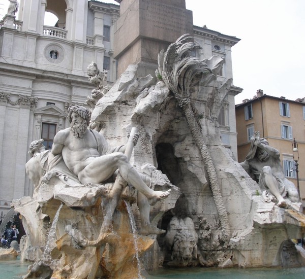 Fontána čtyř řek, která je uprostřed náměstí, je od Berniniho a jeho žáků. Sochy symbolizují čtyři řeky, respektive světadíly – Gangu (Asie), Nil (Afrika), Dunaj (Evropa) a Rio della Plata (Amerika).
