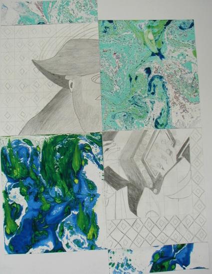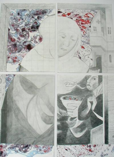 Na závěr si studenti připravili výrazně barevné "benzinové" papíry, které dolepovali do kreseb - buď ve formě rámů nebo jako některé plochy v kresbě samotné. Tímto studenti měli docílit efektu gotické kombinace materiálů a také zvýraznit barevným kontrastem černobílé dílo.