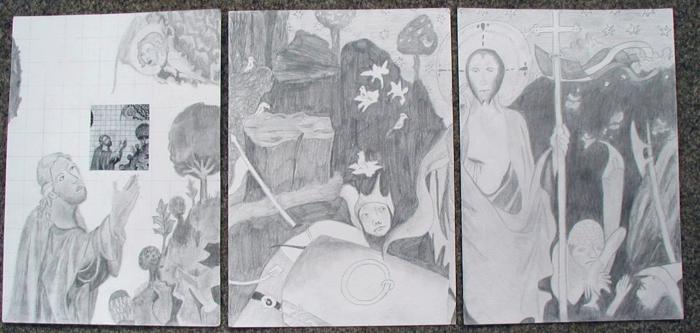 Práce vytvářeli studenti ve skupinách (obvykle po čtyřech). Kopii reprodukce gotické malby si rozdělili na části a pomocí sítě každý svou část zvětšil do předem stanovené velikosti. Technika byla jednoduchá: tužková kresba. V další fázi skupina jednotlivé části opět složila dohromady do jednoho výsledného celku.