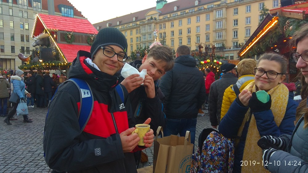 Samozřejmě v předvánočním čase není možné vynechat i nejstarší vánoční trhy Striezelmarkt, kde jsme si ověřili naše znalosti z německého jazyka a ochutnali vánoční čaj či dětský punč v typickém hrnečku. Nádherná byla i 14,61 m vysoká krušnohorská stupňová pyramida, která tvoří dominantu celých trhů. Nasáli jsme vůni františků, dřeva, pečiva, ovoce v čokoládě, štoly, zakousli bratwurst a vánočně se naladili.