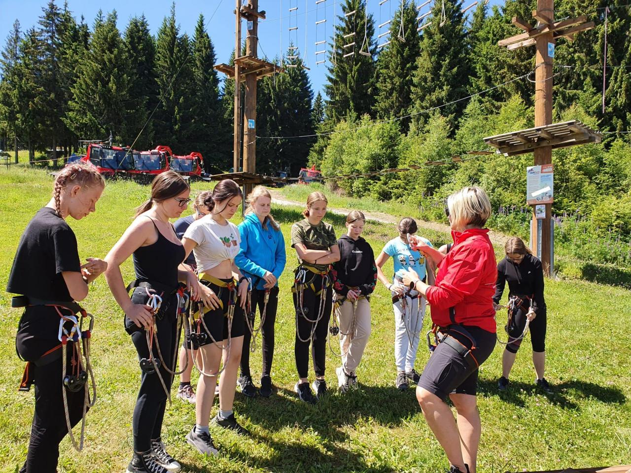 Druhý den jsme vyjeli autobusem na Klínovec, kde na nás již čekaly obr koloběžky a sjezd zadem po sjezdovce. Další atrakcí bylo lanové centrum, to dalo zabrat i velkým sportovcům z naší třídy, kterým se hlavně u jedné překážky pěkně podlamovala kolena. Zasoutěžili jsme si i v lukostřelbě, vyhrál samozřejmě tým s paní třídní! A aby toho sportu nebylo málo, i třetí den jsme byli aktivní, tentokrát jsme si vyzkoušeli Adventure Golf, nové lákadlo na kláštereckém koupališti. Tři dny plné pohody a legrace jsme zakončili kulturním zážitkem, šli jsme totiž podpořit tanečnice od nás ze třídy, které měly připravený absolventský program v novém kulturním domě.