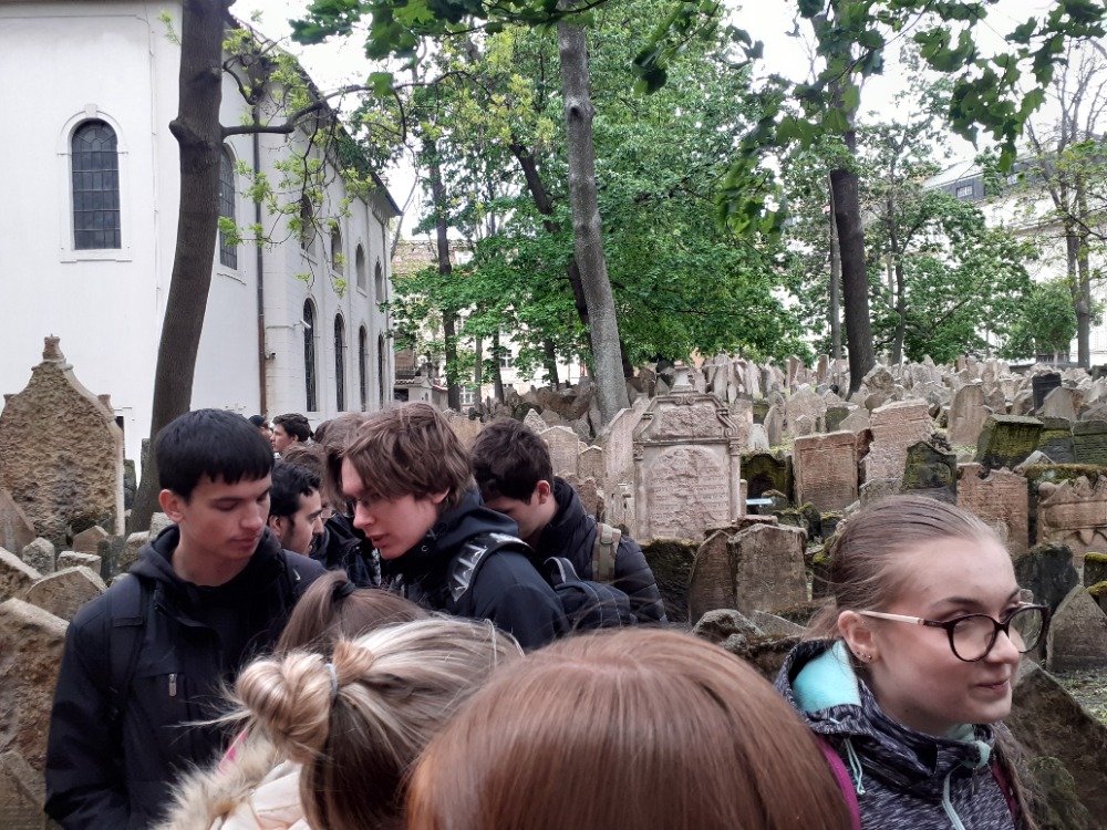 Ve druhé části exkurze se studenti ocitli v úplně jiné kapitole dějin - v Židovském městě. I tady se nejprve ponořili do dávné historie, získali poznatky o příchodu Židů do Prahy, o jejich životě, zvycích, svátcích. V Pinkasově synagoze s údivem pročítali více než 70 tisíc jmen Židů kteří zahynuli v průběhu 2.sv.války. Velice poučná byla návštěva Staronové synagogy, a v Maiselově synagoze sledovali Langweilův model Prahy. Posledním místem trasy po židovských památkách byla Španělská synagoga postavená v maurském slohu.