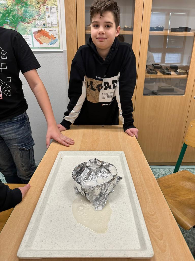 K výbuchu naštěstí nedošlo, protože jsme použili jen ocet, do kterého jsme přidali jedlou sodu. A tak jsme jen viděli, jak by mohla vytékat z kráteru láva. Při té příležitosti jsme si uvědomili, že když se podíváme z okna, vidíme "Mravenčák" nebo Černý vrch, což kdysi v dávné minulosti byly také sopky, dnes už vyhaslé.