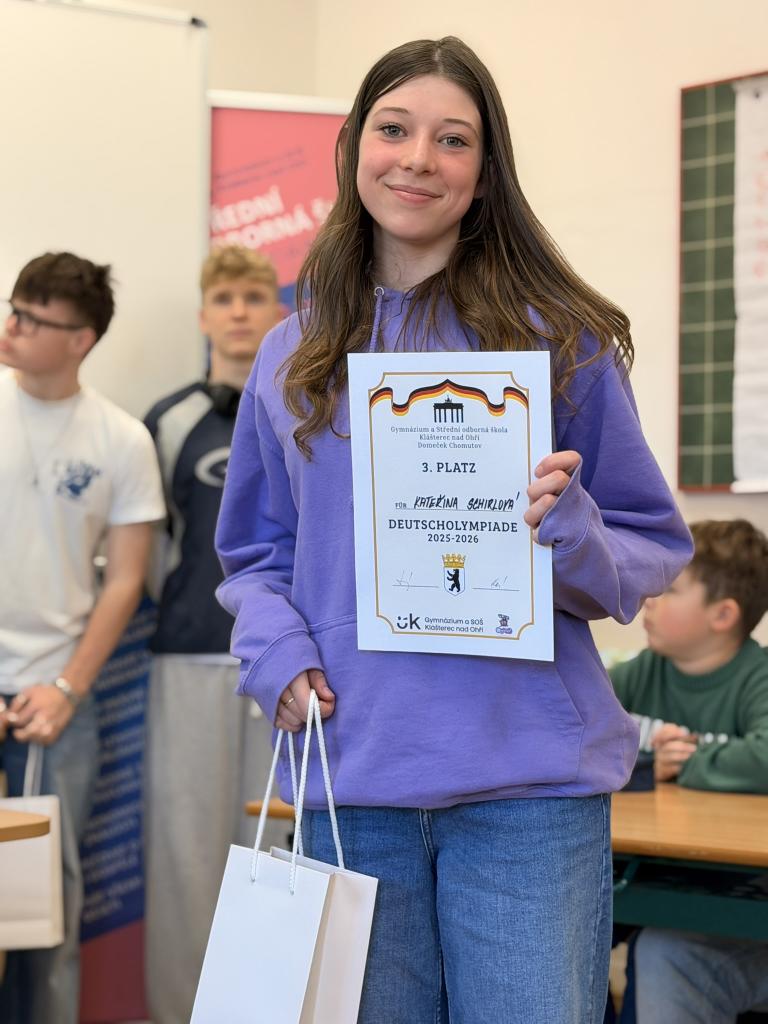Další třetí místo obsadila Kateřina Schirlová z tercie. Rovně moc děkujeme Anitě Anně Komárkové z kvarty za účast ve druhé kategorii.